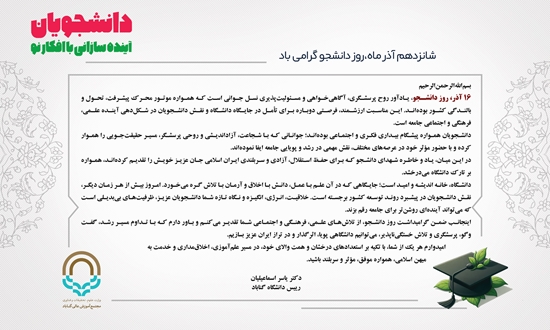 بسماللهالرحمنالرحیم ۱۶ آذر، روز دانشجو، یادآور روح پرسشگری، آگاهیخواهی و مسئولیتپذیری نسل جوانی است که همواره موتور محرک پیشرفت، تحول و بالندگی کشور بودهاند. این مناسبت ارزشمند، فرصتی دوباره برای تأمل در جایگاه دانشگاه و نقش دانشجویان در شکلدهی آینده علمی، فرهنگی و اجتماعی جامعه است.