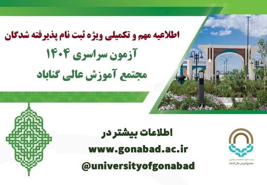 ضمن تبریک صمیمانه به پذیرفته‌شدگان گرامی در دانشگاه گناباد، خواهشمند است اطلاعیه زیر را با دقت مطالعه کرده و مراحل ثبت‌نام اینترنتی و حضوری را در زمان مقرر تکمیل فرمایید.