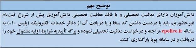 10. رسید درخواست معافیت تحصیلی از سامانه سخا؛ مدرک وضعیت نظام وظیفه ویژه برادران (کارت پایان خدمت یا کارت معافیت در صورت دارا بودن) از ارسال معافیت دانش آموزی خودداری نمایید.