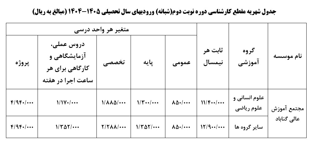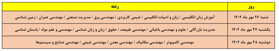پس از پایان ثبت نام اینترنتی، جهت تحویل مدارک ثبت نامی و ثبت نام حضوری از روز شنبه 26 مهر ماه لغایت دوشنبه 28 مهر ماه مطابق با جدول زیر با در دست داشتن اصل مدارک خواسته شده به مجتمع آموزش عالی گناباد مراجعه نمایید.